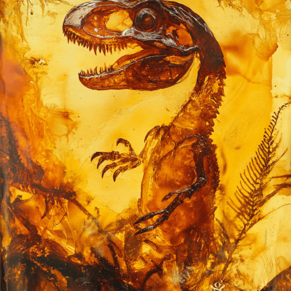 Mensaje: El ámbar conserva la historia de la Tierra, atrapando ecos de un pasado ancestral. En esta obra, un dinosaurio emerge entre las capas de resina fosilizada, simbolizando la permanencia del tiempo y la fragilidad de la existencia.