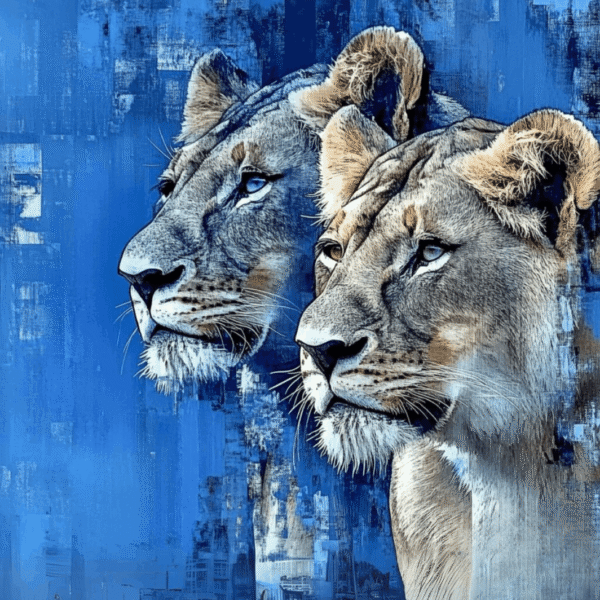 Apreciación técnica: Hiperrealismo con textura pictórica sobre un fondo abstracto en tonos azules. La combinación de realismo y abstracción resalta la presencia imponente de las leonas.