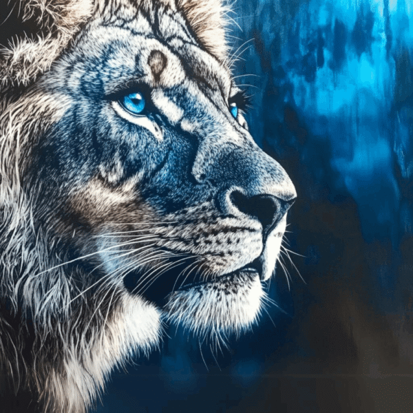 Apreciación técnica: Hiperrealismo digital con contrastes marcados. La profundidad del pelaje y el brillo en los ojos resaltan su majestuosidad, mientras el fondo etéreo en tonos azules aporta un aura mística.