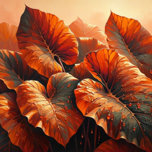 Descripción: Una sinfonía visual de hojas exuberantes de Alocasia, envueltas en tonos ocres intensos, sombras verdes profundas y gotas de rocío que capturan el instante con una sensibilidad casi escultórica. Esta obra transmite vida, ritmo y contemplación, invitando al espectador a detenerse y respirar la belleza orgánica del mundo natural.